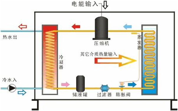 空氣源熱泵是由電動機驅(qū)動,利用蒸汽壓縮制冷循環(huán)工作原理:蒸發(fā)器通過吸收空氣中的熱量,將低溫低壓的氣液混合體轉(zhuǎn)化為常溫低壓氣體,通過壓縮機被壓縮為高溫高壓的氣體,在冷凝器中將熱量傳遞為水,加熱水。冷凝器中出來的是常溫高壓的氣液混合體,在膨脹閥節(jié)流、降低壓力的作用后,變?yōu)榈蜏氐蛪旱臍庖夯旌象w,再一次進入蒸發(fā)器進行循環(huán)。