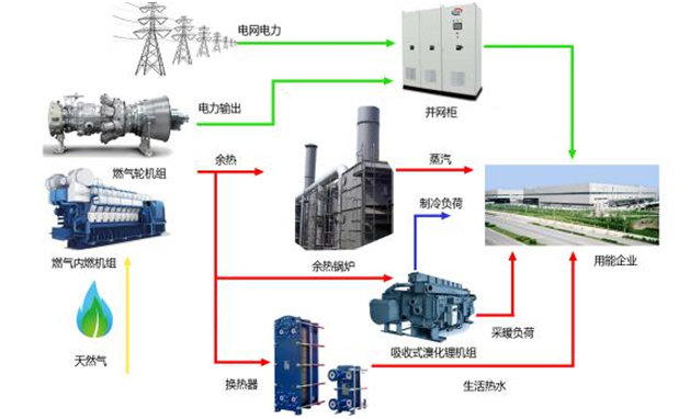 分布式能源系統(tǒng)是以天然氣作為一次能源,利用燃料高品位的能量發(fā)電,產(chǎn)生的電力與市電共同解決用戶的電力需求,同時(shí)通過(guò)余電回收利用設(shè)備(如溴化鋰吸收式機(jī)組、余電鍋爐及換熱器等)回收發(fā)電機(jī)組余熱熱量,向用戶供熱(或供冷),滿足用戶的熱(冷)需求。分布式能源系統(tǒng)通過(guò)冷熱電三聯(lián)供等方式實(shí)現(xiàn)能源的梯級(jí)利用,綜合能源利用效率在70%以上。